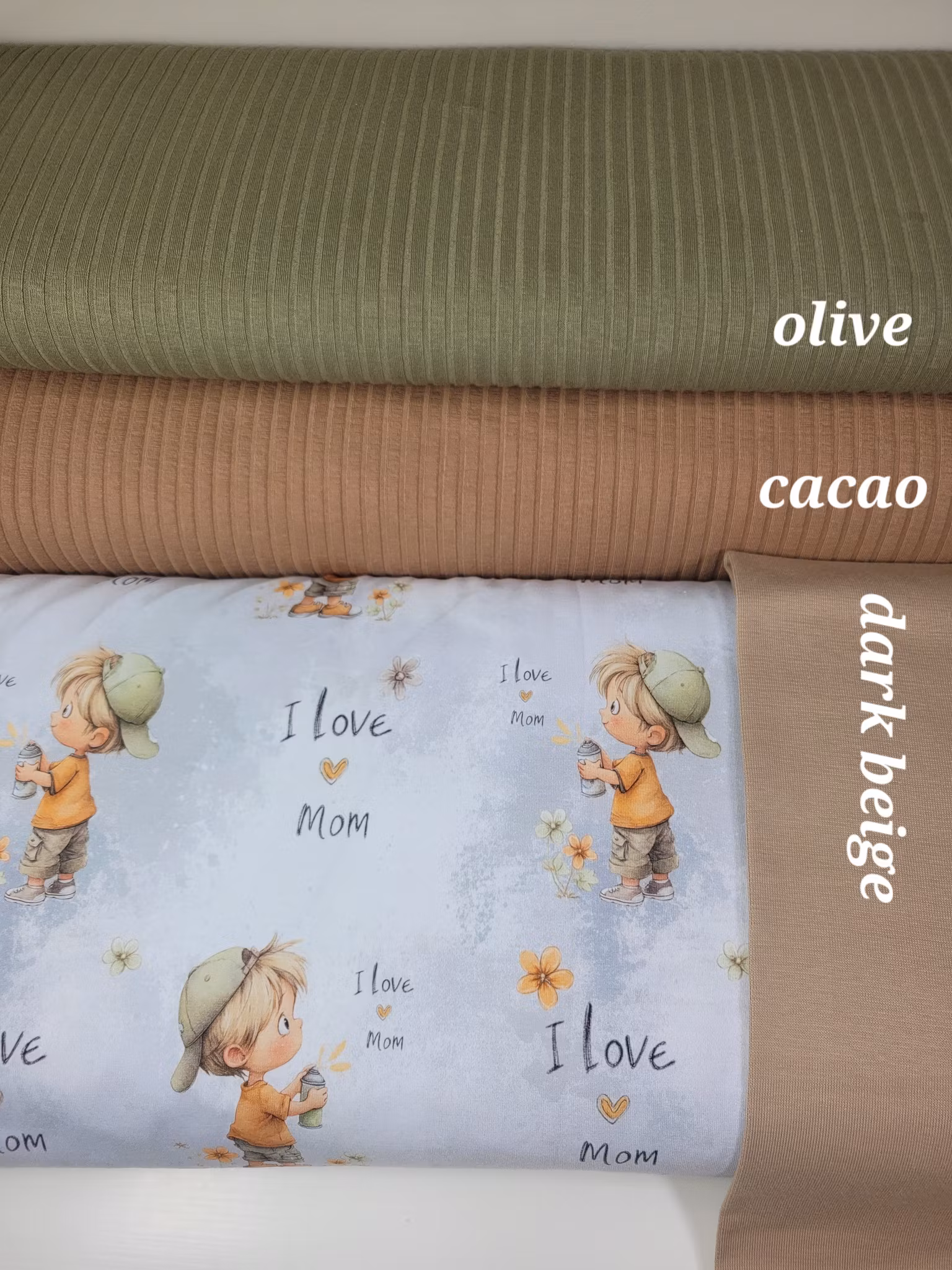 I love mom jersey På lager Antall: 57 24,- LEGG I HANDLEKURVEN I love momEigenprodusert jerseyBredde: 150 cm220 gram pr kvm95% Bomull 5% LycraOeko Tex sertifisertAnbefalt maskinvask på 30 grader.1 = 10 cm2 = 20 cm3 = 30 cmosv.