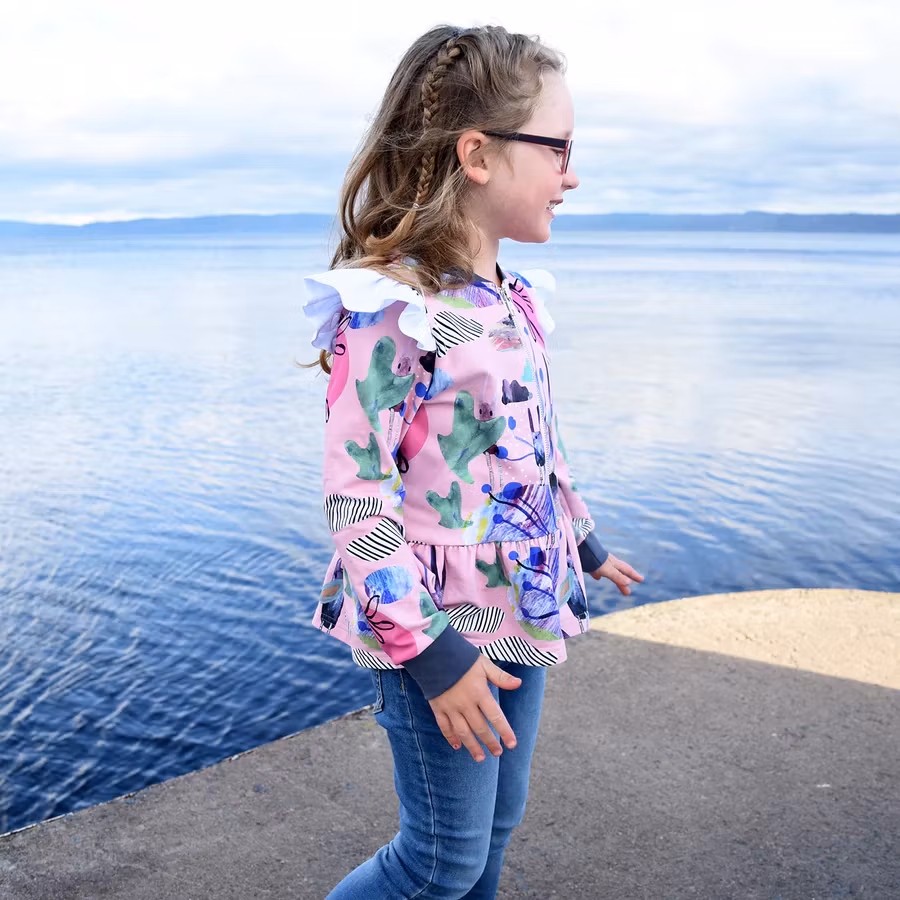 Bomberjackan kan även sys med en rynkad peplum, istället för midjemudd. Till alla varianter kan du även välja att sy volanger på axlarna.