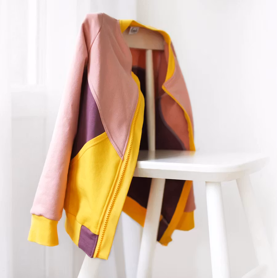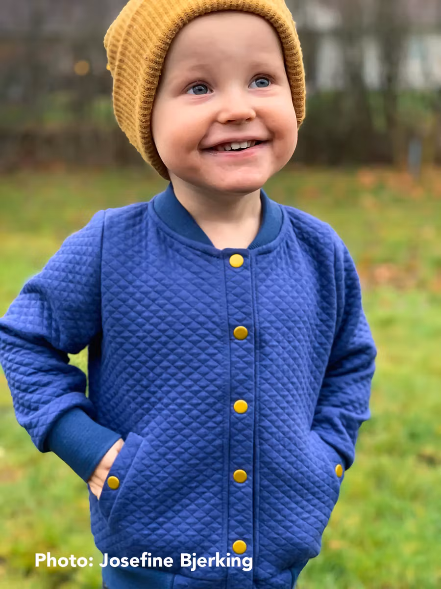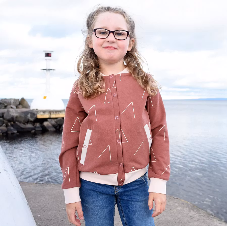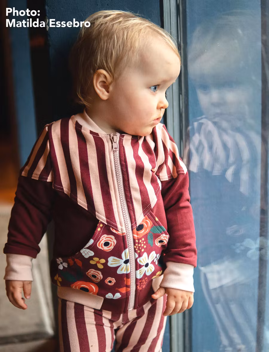 Bomberjackan Billy & Betty är designad att sys i medel till kraftiga trikåtyger så som college och jogging. Den är perfekt att bära som tröja inomhus, över t.ex. en t-shirt, eller som en lätt sommarjacka.