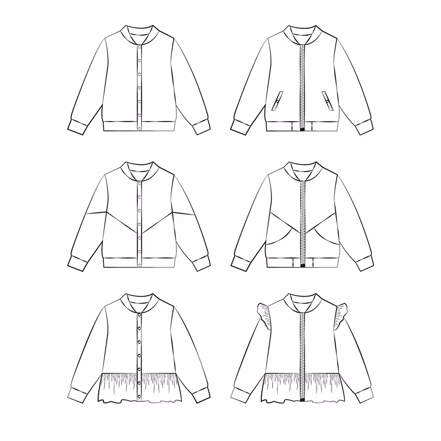 Alla versioner kan sys med antingen blixtlås, eller knapplist och tryckknappar. Bomberjackan kan sys med midjemudd, här kan du även välja att sy stolpfickor eller färgblocka jackan och sy den med eller utan fickor. Även ärmarna kan färgblockas om du önskar.
