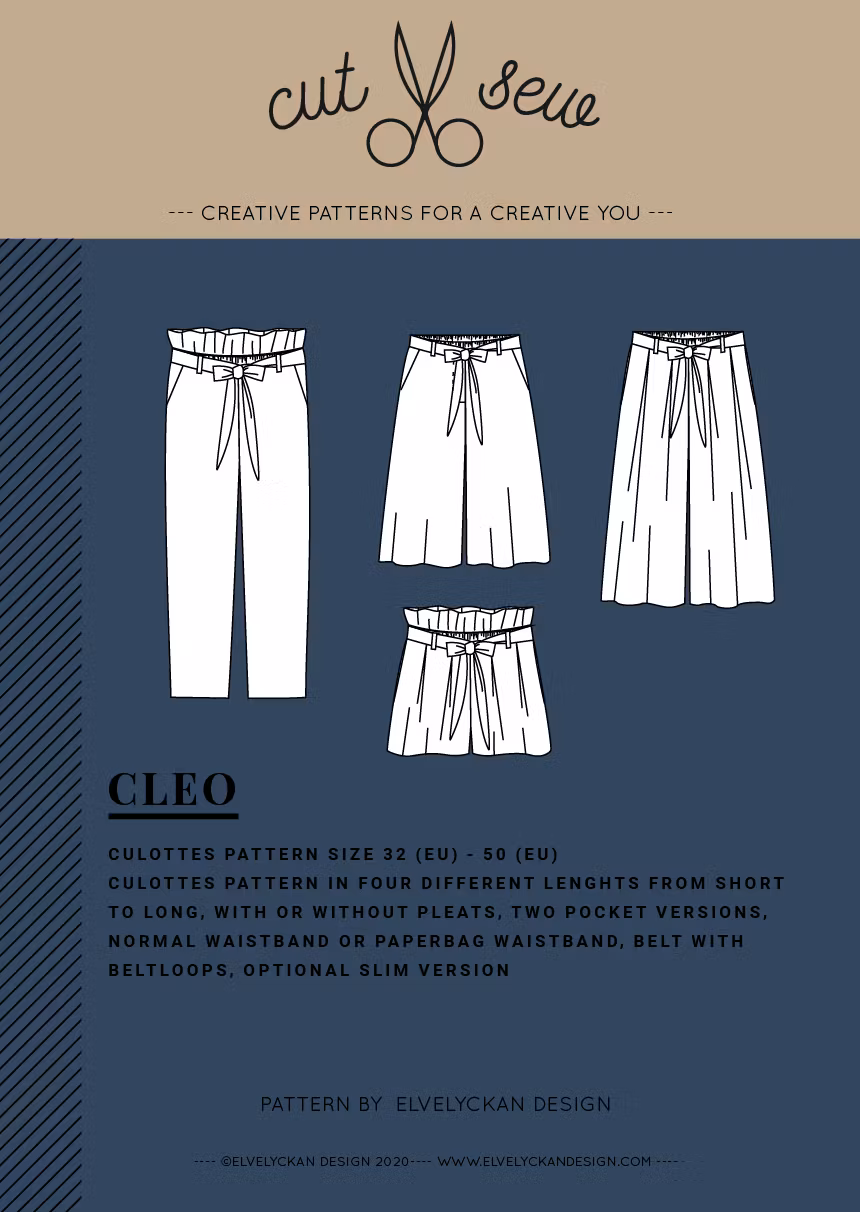 CLEO is a culotte pattern for woven and knitted fabrics. This pattern includes a lot of variations, you can choose between 4 different lenghts, 2 pocket versions and 2 waistband versions, as well as an optional slim version. The instructions are written as simple as possible, so regardless if this is your first trouser or fifth, we hope you will have both fun and success in sewing CLEO.