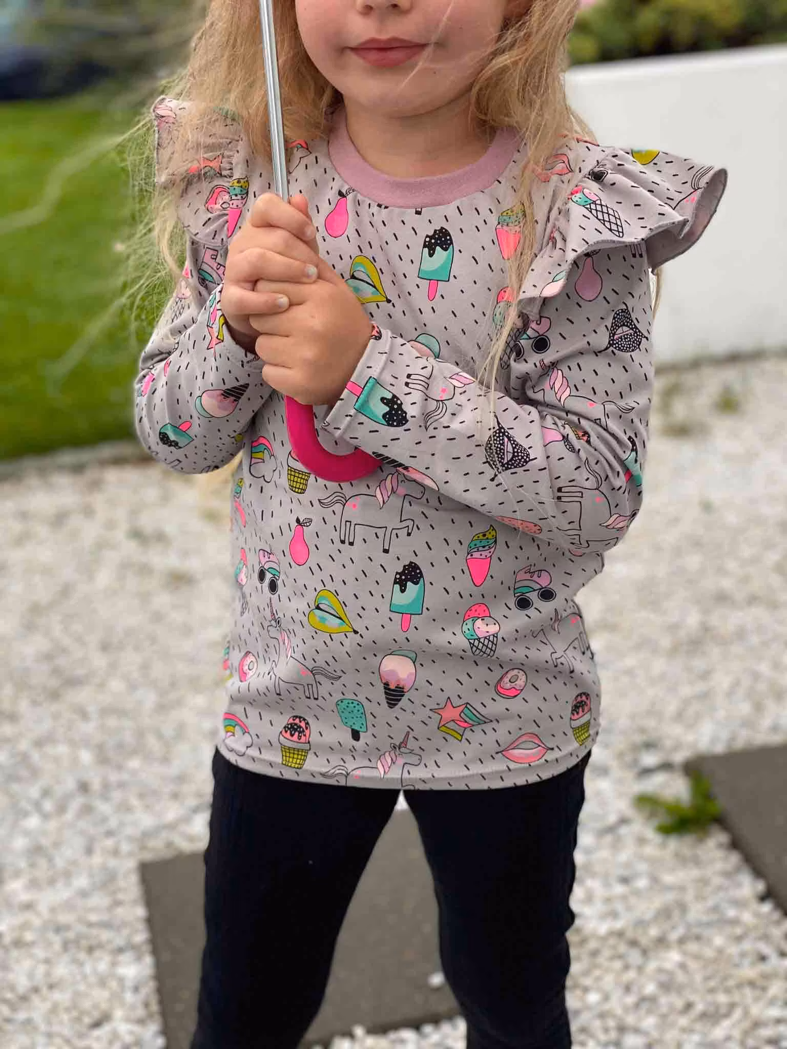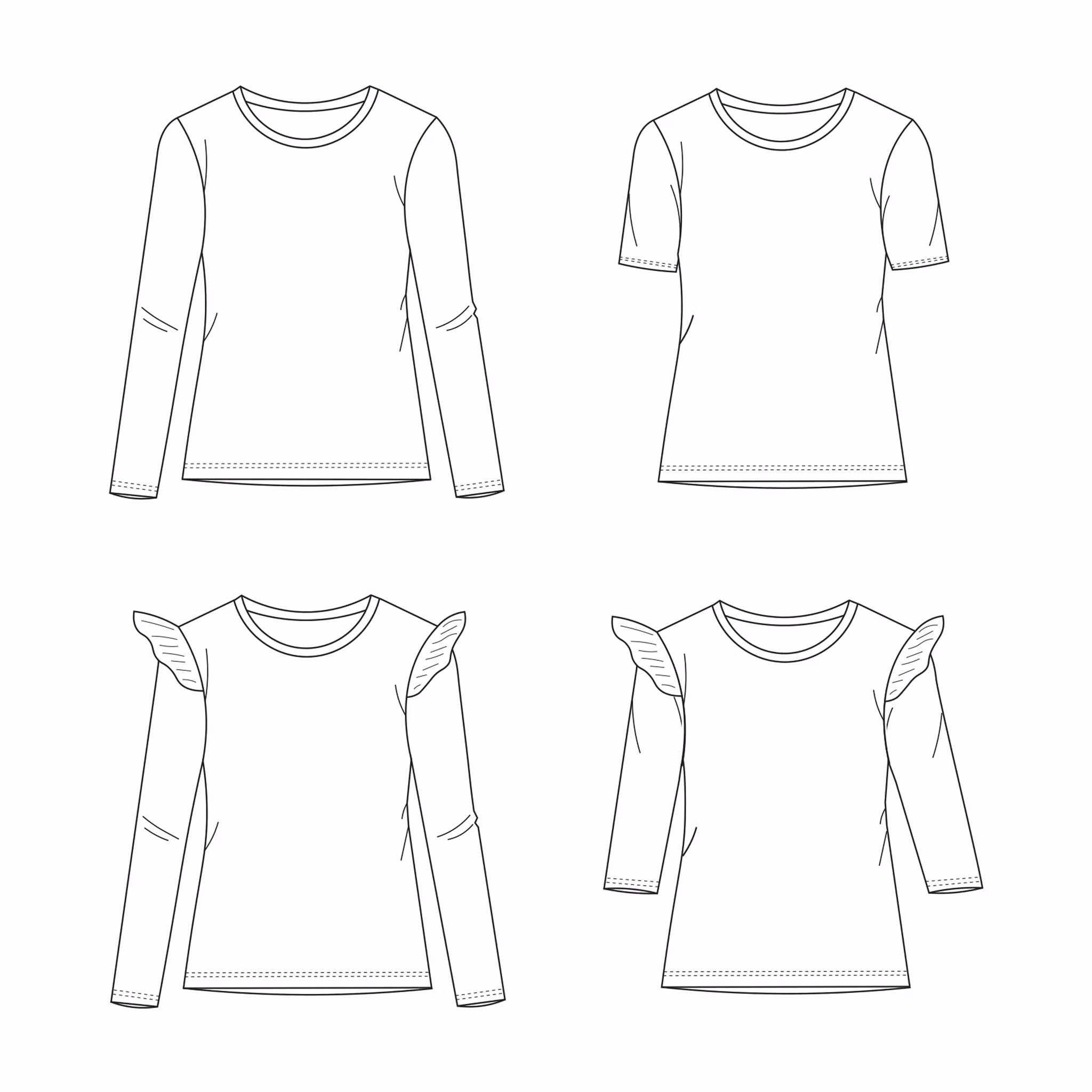 Med dette symønsteret har du mulighet til å sy trøyer med korte, lange eller 3/4 ermer. I tillegg følger det med volanger som gir et elegant uttrykk. Trøyen har en herlig passform og du kan ha gleden av dette mønsteret året rundt. Vår store favoritt i garderoben!