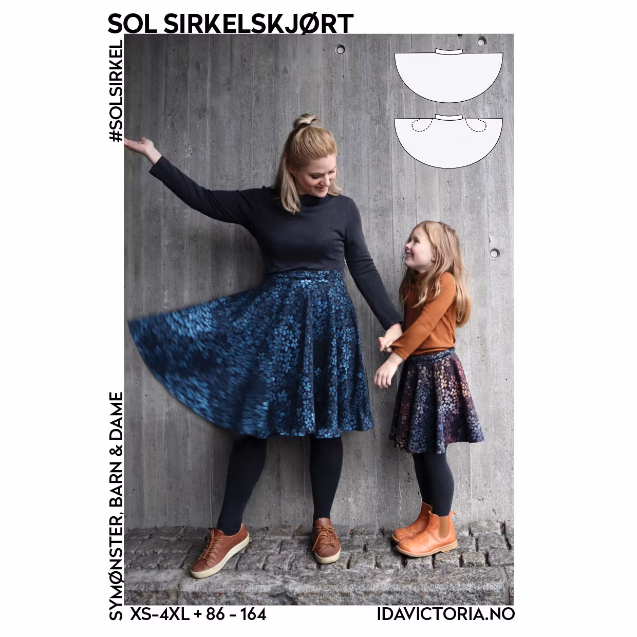 SOL SIRKELSKJØRT fra Ida Victoria er et enkelt skjørt, som sys i stretchstoff. Linningen sys i samme stoff som skjørtet, med strikk inni. Du kan også sy en enklere variant, med ribbekant i livet. Skjørtet i damestørrelser kan sys i tre ulike lengder. Du kan velge om du syr full sirkel uten sidesømmer, eller om du deler opp mønsteret slik at skjørtet får en søm i hver side. Om du syr med sidesømmer, kan du også sy lommer i skjørtet.